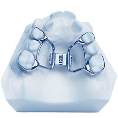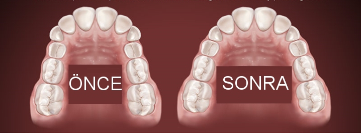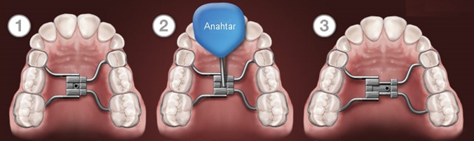 Aşağıdaki resimde, sabit bir genişletme apareyinin çalışma sistemi tarif edilmiştir. Bu tip sabit genişletme apareyleri, azı dişlerine yapıştırılan metal bantlar ve bir vida aracılığıyla genişletme sağlar.  Ortodontistinizin belirlediği aralıklarla vidanın çevrilmesi gerekir.